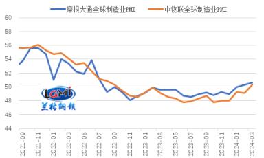 另據摩根大通數據顯示,2024年3月份,摩根大通全球制造業(yè)PMI指數為50.6%,較上月回升0.3個百分點;其中,產出指數、新訂單指數在擴張區(qū)間繼續(xù)回升,其中,產出指數較上月回升0.7個百分點,至51.9%;新訂單指數較上月回升0.5個百分點,至50.9%。2024年3月份監(jiān)測的20個全球主要國家和地區(qū)制造業(yè)PMI指數中有10個國家制造業(yè)PMI處于50%以上,與上月持平;有11個國家及地區(qū)制造業(yè)PMI指數較上月有所回升,占比達55%,較上月下滑15個百分點,反映全球制造業(yè)恢復態(tài)勢有所分化。