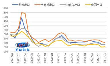 目前我國厚壁鋼管出口報價優(yōu)勢仍存。研究中心監(jiān)測數據顯示,截至2024年4月11日,印度、土耳其、獨聯體熱軋卷板出口報價(FOB)分別為560美元/噸、605美元/噸和565美元/噸,中國熱軋卷板出口報價(FOB)為515美元/噸;目前我國熱卷出口報價分別較印度、土耳其、獨聯體熱卷出口報價低45美元/噸、90美元/噸和50美元/噸(詳見圖4)。