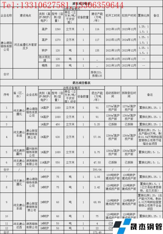 唐山港陸鋼鐵有限公司退出1080m3高爐2座、退出產(chǎn)能182萬噸;75t轉(zhuǎn)爐2座,退出產(chǎn)能3.5萬噸/年;唐山新寶泰鋼鐵有限公司450m3高爐1座,退出產(chǎn)能5.25萬噸/年;630m3高爐1座,退出產(chǎn)能57.06萬噸/年;60t轉(zhuǎn)爐2座,退出產(chǎn)能143.99萬噸/年;霸州新利鋼鐵有限公司1080m3高爐1座,退出產(chǎn)能8.75萬噸/年;津西鋼鐵有限公司退出550m3高爐1座,退出產(chǎn)能47.58萬噸/年;50t轉(zhuǎn)爐2座,退出產(chǎn)能26萬噸/年。共計(jì)退出煉鐵產(chǎn)能300.64萬噸,煉鋼產(chǎn)能173.49萬噸,所有項(xiàng)目將于新建項(xiàng)目建成投產(chǎn)前拆除。
