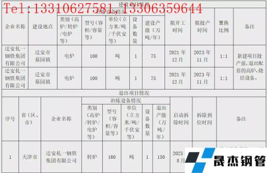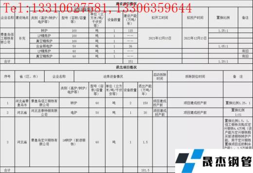 秦皇島佰工鋼鐵有限公司退出60t轉(zhuǎn)爐2座,產(chǎn)能150萬噸/年;河北吉泰特鋼有限公司退出50t電爐1座,產(chǎn)能30萬噸/年;秦皇島宏興鋼鐵有限公司退出60t轉(zhuǎn)爐1座,產(chǎn)能1.5萬噸/年。共計(jì)退出煉鋼產(chǎn)能181.5萬噸,所有項(xiàng)目將于新建項(xiàng)目建成投產(chǎn)前拆除。