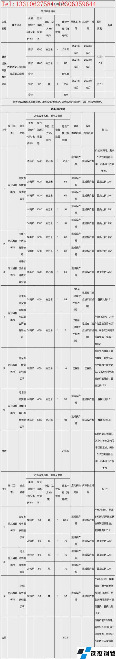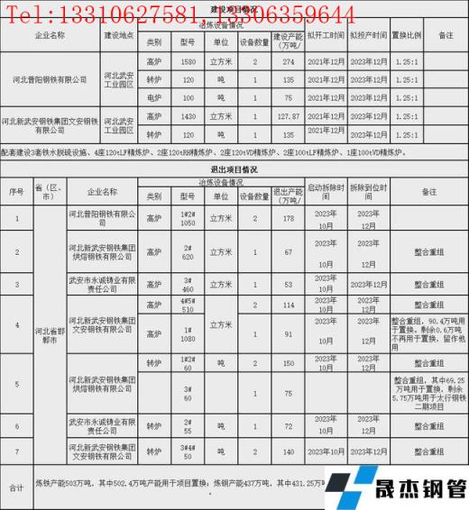 河北普陽鋼鐵有限公司退出高爐1050m3高爐2座,退出產(chǎn)能178萬噸/年。河北新武安鋼鐵集團(tuán)烘熔鋼鐵有限公司退出620m3高爐1座,退出產(chǎn)能67萬噸/年;退出60t轉(zhuǎn)爐3座,產(chǎn)能225萬噸/年。武安市永誠(chéng)鑄業(yè)有限責(zé)任公司退出460m3高爐1座,退出產(chǎn)能53萬噸/年;退出55t轉(zhuǎn)爐1座,產(chǎn)能72萬噸/年。河北新武安鋼鐵集團(tuán)文安鋼鐵有限公司退出510m3高爐2座,退出產(chǎn)能114萬噸/年;退出1080m3高爐1座,退出產(chǎn)能91萬噸/年;退出50t轉(zhuǎn)爐2座,產(chǎn)能140萬噸/每年。共計(jì)退出煉鐵產(chǎn)能503萬噸,其中502.4萬噸產(chǎn)能用于項(xiàng)目置換;退出煉鋼產(chǎn)能437萬噸,其中431.25萬噸產(chǎn)能用于項(xiàng)目置換,所有項(xiàng)目將于2023年10月前拆除。