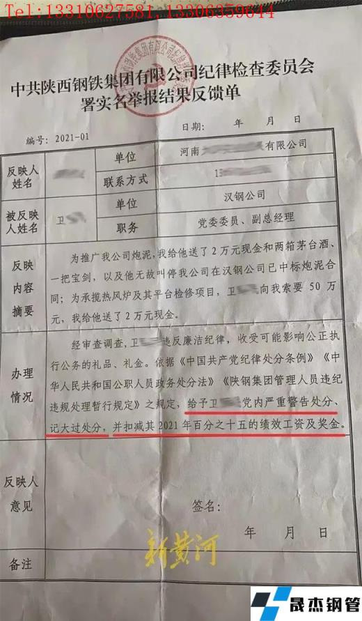 2021年4月,針對衛(wèi)某主動索賄、受賄一事,王木生向陜西省國資委、漢中市紀檢委等部門進行了實名舉報。11月18日,新黃河記者了解到,陜鋼集團紀委已對衛(wèi)某下達了處理結(jié)果:給予衛(wèi)某記大過及黨內(nèi)嚴重警告處分,并扣減2021年15%的績效工資及獎金。紀委工作人員表示,對衛(wèi)某已經(jīng)按照相關(guān)規(guī)定進行了內(nèi)部處理,所收的相應(yīng)贓款也已經(jīng)沒收。