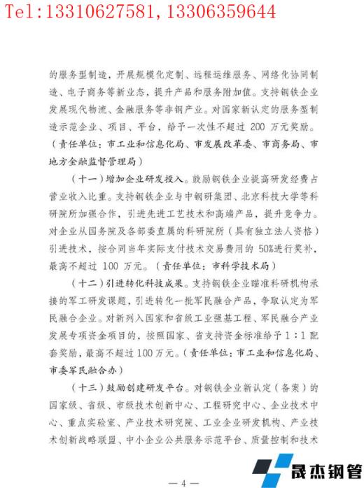 對鋼鐵企業新認定(備案)的國家級、省級、市級技術創新中心、工程研究中心、企業技術中心、重點實驗室、產業技術研究院、工業企業研發機構、產業技術創新戰略聯盟、中小企業公共服務示范平臺、質量控制和技術,評價實驗室、技術創新示范企業、"三品"示范企業,分別給予100萬元、20萬元、10萬元資金補助。對鋼鐵企業新認定為高新技術企業的,給予20萬元獎勵。