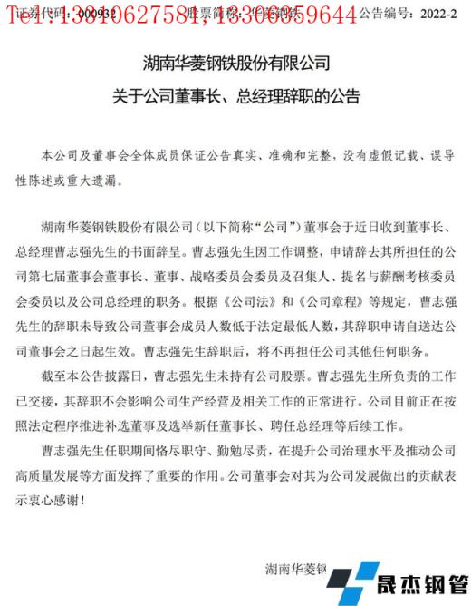日前,湖南華菱鋼鐵股份有限公司發布公告稱,公司董事會于近日收到董事長、總經理曹志強的書面辭呈。曹志強因工作調整,申請辭去其所擔任的公司第七屆董事會董事長、董事、戰略委員會委員及召集人、提名與薪酬考核委員會委員以及公司總經理的職務。