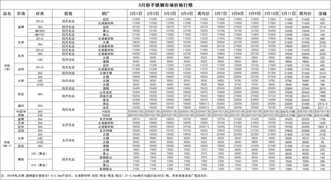 受到鎳價(jià)格上漲影響,國(guó)內(nèi)近期不銹鋼市場(chǎng)動(dòng)蕩較明顯,3月第2周不銹鋼市場(chǎng)價(jià)格較3月第1周有明顯的的上漲情況,上漲幅度最高每噸可達(dá)21900元/噸的價(jià)格。其中冷軋201不銹鋼在3月4日價(jià)格達(dá)到11200元/噸,并于3月7日價(jià)格迅速調(diào)整到11500元/噸,價(jià)格上漲300元/噸。同系列冷軋201不銹鋼于3月10日價(jià)格回調(diào)至11500,降幅達(dá)到350元/噸。