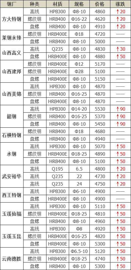 上調(diào)12家,占比85.7%,調(diào)價(jià)幅度20-50元/噸;