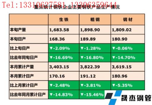 2月24日訊,2月中旬,重點統計鋼鐵企業共生產粗鋼1898.9萬噸、生鐵1683.58萬噸、厚壁鋼管1809.02萬噸。其中,粗鋼日產189.89萬噸,環比下降1.28%;生鐵日產168.36萬噸,環比下降2.09%;厚壁鋼管日產180.9萬噸,環比下降0.06%。厚壁鋼管庫存量1690.35萬噸,比上一旬增加4.95萬噸,增長0.29%;比去年同期減少64.38萬噸,下降3.67%。