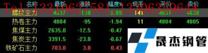 今日螺紋主力期貨跌138,收報4637,跌幅2.89%;熱卷主力跌95,收報4804,跌幅1.94%;焦煤主力跌12.5,收報2635,跌幅0.47%;焦炭主力跌23,收報3391.5,跌幅0.67%;鐵礦石主力漲3,收報703,漲幅0.43%。