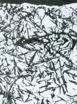 淬火加熱的目的是使工件在淬火過程中完成組織轉(zhuǎn)變。為此,必須加熱到適當(dāng)溫度并有足夠保溫時間。加熱溫度偏低和保溫時間不足使得原珠光體組織未能完全轉(zhuǎn)變?yōu)閵W氏體和轉(zhuǎn)變的奧氏體成分不均勻,淬火后得不到完全馬氏體組織,結(jié)果使工件淬火后形成軟點。 圖1 為T12鋼制造的手用絲錐因加熱不足形成的顯微組織:細(xì)針馬氏體+淬火托氏體+珠光體。性能上表現(xiàn)為硬度不均勻。