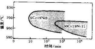 然而在某個特定溫度區(qū)間和時間參數(shù)下進(jìn)行熱處理或在某個溫度區(qū)間長期使用時,由于含鉻碳化物沿晶界析出將導(dǎo)致晶界腐蝕抗力的急劇下降。表示發(fā)生晶界腐蝕的熱處理溫度和時間關(guān)系曲線叫做時間-溫度-敏化曲線(T-T-S曲線)。圖6 就是奧氏體不銹鋼的典型T-T-S曲線。在C型曲線的右側(cè)熱處理狀態(tài)下,不銹鋼易產(chǎn)生晶間腐蝕。