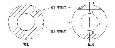 橫向壓扁及通過疊加橢圓壓扁變形來達(dá)到矯直的目的。在矯直截面中產(chǎn)生如圖8-9中BCDE的塑性區(qū)。這對矯直效果是非常重要的,因?yàn)閺澢C直不能使截面全部為塑性區(qū),利用壓扁變形來補(bǔ)償。另外,對局部彎曲、管端彎曲、縱向彎曲矯直效果很差,必須是縱向彎曲和壓扁的共同作用才能達(dá)到滿意的矯直效果。(注:提高厚壁鋼管壁厚精度可提高厚壁鋼管的抗壓