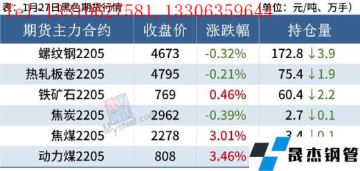 焦炭:1月27日,焦炭市場暫穩運行。唐山地區大部分鋼企在28日左右均有高爐檢修計劃,個別鋼企表示檢修將持續到3月中上旬。山西長治地區1月30日-3月13日冬奧會期間,區域內焦企結焦時間延長至72小時限產政策影響;個別焦企明后兩天,環保管控結焦時間將延長至72小時,大部分焦企暫無接到冬奧會相關限產通知。焦企開工都維持在較高水平,焦企多保持低庫存或零庫存,臨近年尾,出貨力度加快,下游無縫鋼管廠家多正常接貨,近期受風雪等惡劣天氣影響,汽運不便,短期無縫鋼管廠家需求尚可,保持正常按需采購節奏,預計短期內焦炭市場繼續偏穩運行,后期需繼續關注環保政策、冬奧會、原料成本對焦炭價格的影響。