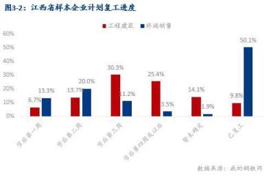 從樣本企業復工時間計劃來看,終端銷售樣本企業已復工50.1%,預計在節后第二周復工率達到83.4%;工程建筑企業復工時間相對較晚,僅9.8%企業已經復工,69.4%主要集中在節后第二周以后復工。