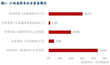 4、調研企業資金情況發現:從企業當前現金流情況來看,據調研,63.7%的樣本企業資金流是比較或者非常充裕的,30.1%的樣本企業資金有些緊張,僅能維持1-3個月,而資金壓力比較及非常緊張的樣本企業占比6.2%。