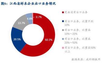據調研,61%的樣本企業沒有出口業務,39 %的樣本企業有出口業務,出口業務比重大多集中在10%以內。