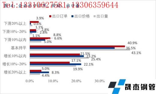據調研,35.5%的樣本企業有出口業務,出口業務比重大多集中在20%以內。40.9%的企業出口訂單量較去年同期比基本持平,43.6%的企業出口訂單量同比有增長,15.5%的企業出口訂單同比有下降,主要是受全球疫情,以及中美貿易摩擦的影響。36.5%的企業出口價格較去年同期比基本持平,53.6%的企業出口價格同比有上漲,9.9%的企業出口價格同比出現下降。43.1%的企業出口量較去年同期比基本持平,49.7%的企業出口量同比有增長,主要是產品的類別和客戶都有增加,7.2%的企業出口量同比有所下滑,主要是受外幣貶值以及疫情影響下運輸成本提高的個影響。