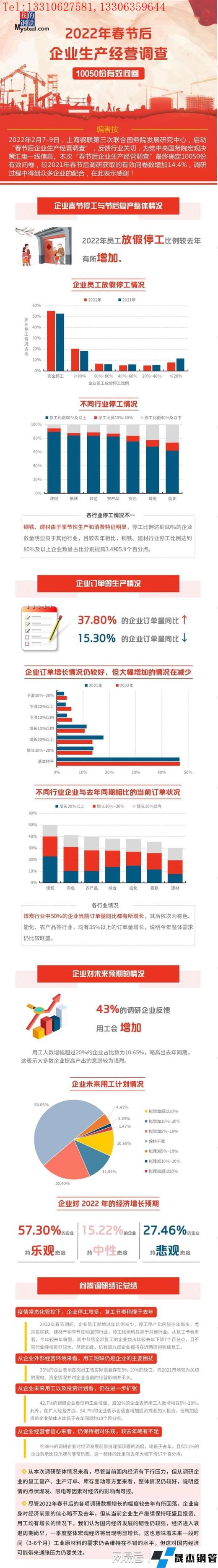 2022年2月7-9日,上海鋼聯(lián)第三次聯(lián)合國務(wù)院發(fā)展研究中心,啟動“春節(jié)后企業(yè)生產(chǎn)經(jīng)營調(diào)查”,反饋行業(yè)關(guān)切,為黨中央國務(wù)院宏觀決策匯集一線信息。本次“春節(jié)后企業(yè)生產(chǎn)經(jīng)營調(diào)查”最終確定10050份有效問卷,較2021年春節(jié)后調(diào)研獲取的有效問卷數(shù)增加14.4%。 具體結(jié)論如下: