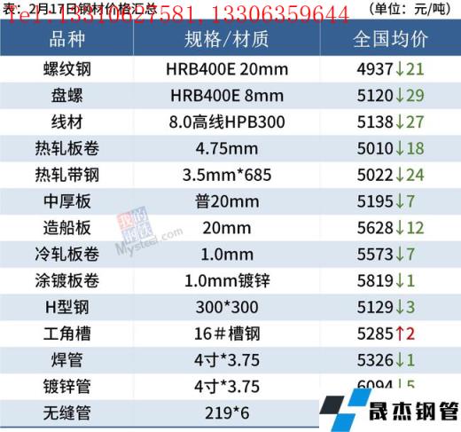 建筑厚壁無縫鋼管:2月17日,全國31個主要城市20mm三級抗震螺紋鋼均價4937元/噸,較上個交易日下跌21元/噸。本周螺紋鋼產量邊際回升,廠庫下降,但社庫增幅明顯,不過本周表觀消費量繼續回升,說明需求端邊際向好。短期來看,由于當前需求并未完全釋放,短期市場運行邏輯仍然是情緒面驅動,原料承壓對于現貨仍有一定拖累。因此預計18日國內建筑厚壁無縫鋼管價格或將繼續趨弱。
