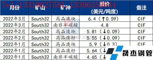 South32對(duì)華3月裝船報(bào)價(jià):高品澳塊6.4美元/噸度(漲0.59),南非半碳酸4.8美元/噸度。