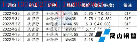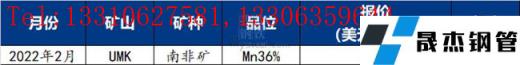 UMK2022年3月對(duì)華錳礦裝船報(bào)價(jià)Mn36南非半碳酸4.7美元/噸度,環(huán)比上漲0.2美元/噸度。