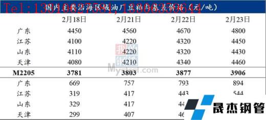具體來看下表最近4個交易日豆粕期現貨價格,以沿海主要區域廣東、江蘇、山東、天津為例。出現豆粕現貨單邊價格與基差價格齊飛盛況,怎一“漲”’字了得?豆粕現貨價格每個交易日超100元/噸的速度飛奔。據農產品數據顯示,沿海主要區域2月18-2月22日現貨價格由4080-4450元/噸,漲至4430-4800元/噸,累計上漲350元/噸,累計漲幅7.87%-8.58%;現貨基差價格由299-699元/噸,漲至524-894元/噸,累計上漲195-225元/噸,累計漲幅2.79-7.53%。