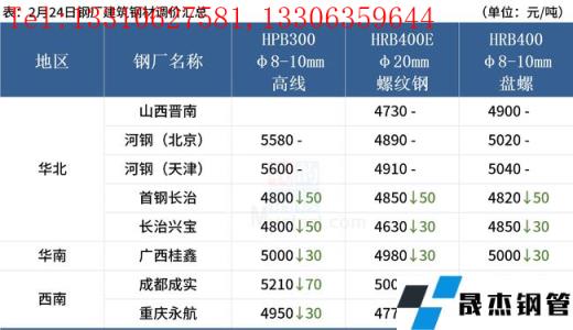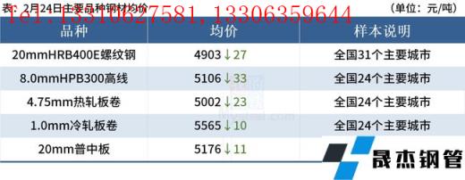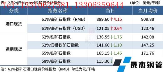 ◎2月24日統(tǒng)計新口徑114家無縫厚壁鋼管廠家進口燒結(jié)粉總庫存3317.49萬噸,燒結(jié)粉總?cè)蘸?5.47萬噸。原口徑64家無縫厚壁鋼管廠家進口燒結(jié)粉總庫存1568.97萬噸,燒結(jié)粉總?cè)蘸?7.32萬噸,庫存消費比33,燒結(jié)礦中平均使用進口礦配比86.39%,無縫厚壁鋼管廠家不含稅平均鐵水成本3107元/噸。詳情>>