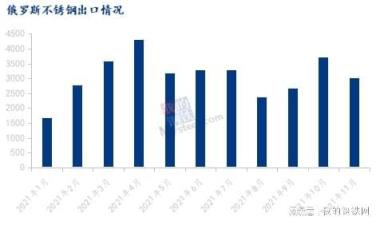 在需求增長帶動下,近年來俄羅斯不銹鋼進口量大幅提升,2021年1-11月進口量累計約43.57萬噸,其中中國進口占比約55%。
