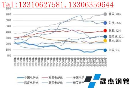 電爐鋼是以電力為能源、以再生鋼鐵料為原料的煉鋼爐生產(chǎn)的鋼。這種短流程煉鋼與以鐵礦石為主要原料的長(zhǎng)流程煉鋼在原料使用上有本質(zhì)的區(qū)別。從電爐鋼的占比情況看,中國(guó)粗鋼生產(chǎn)90%以上依賴(lài)長(zhǎng)流程,即以鐵礦石為主要原料的生產(chǎn)方式,并且受制于國(guó)產(chǎn)鐵精礦的產(chǎn)量不足,對(duì)進(jìn)口鐵礦石的依存度很高。截止到2020年,據(jù)世界鋼協(xié)(WSA)的統(tǒng)計(jì)數(shù)據(jù),全球電爐鋼產(chǎn)量占比為26.1%。主要產(chǎn)鋼國(guó)中,美國(guó)為70.6%,土耳其為69.2%,印度電爐比為55.5%,歐盟(28)為42.4%,俄羅斯為32.1%,韓國(guó)為31.0%,日本為25.4%。中國(guó)電爐鋼占比在20世紀(jì)90年代曾超過(guò)20%,但由于之后中國(guó)長(zhǎng)流程煉鋼規(guī)模迅速擴(kuò)大,電爐鋼占比不斷被稀釋?zhuān)?020年已降至9.2%。從目前情況看,美國(guó)、印度和歐盟鋼鐵生產(chǎn)對(duì)鐵礦石依存度相對(duì)低很多。