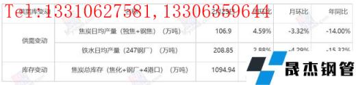 焦炭庫存開始往下游轉移,貿易商、無縫厚壁鋼管廠家采購積極;獨立焦化庫存124.6萬噸,減40.8萬噸;無縫厚壁鋼管廠家焦炭庫存757.7萬噸,增8.7萬噸;港口焦炭庫存267.6萬噸,增21.3萬噸;各環節焦炭總庫存1149.8萬噸,周環比減10.8萬噸;高爐開始復產,焦炭消耗上升,在高爐限產期間,河北部分無縫厚壁鋼管廠家庫存偏低,現復產現實兌現,無縫厚壁鋼管廠家補庫需求驟增,同時市場情緒好轉,港口貿易商也積極拿貨,焦企庫存預計繼續往中下游轉移。焦企庫存壓力大減,這也是焦企提漲的信心所在,銷售順暢,無庫存壓力。