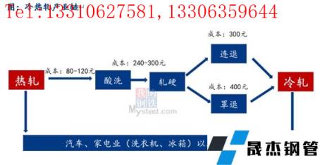 由于熱軋是冷軋的原料,調(diào)研了解有近40%的熱軋被用來生產(chǎn)冷軋,而且冷熱軋終端需求分布有部分重合,因此冷軋與熱軋價(jià)格走勢(shì)高度類似。冷軋板卷是以熱軋卷為原料,在室溫下經(jīng)過酸洗(費(fèi)用80-120元/噸)、軋制(費(fèi)用240-300元/噸),然后連退(費(fèi)用300元/噸)或罩退(費(fèi)用400元/噸)而成,冷軋成本較熱軋多出620-820元/噸。從下游需求分布來看,冷熱軋終端需求分布有部分重合,冷熱軋均被用于汽車、家電業(yè)(洗衣機(jī)、冰箱)以及產(chǎn)業(yè)設(shè)備等。