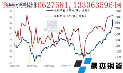 由于考慮到訂單、排產(chǎn)、后續(xù)市場(chǎng)情況等多種因素,無縫厚壁鋼管廠家生產(chǎn)計(jì)劃需提前制定,因此無縫厚壁鋼管廠家不會(huì)輕易減少產(chǎn)量。我們分析歷史情況發(fā)現(xiàn),在虧損較大后,冷軋產(chǎn)量才會(huì)有明顯的下降。由于2021年政策影響較大,我們選取2019-2020年冷軋無縫厚壁鋼管廠家的產(chǎn)量和利潤(rùn)情況發(fā)現(xiàn),產(chǎn)量最低的兩個(gè)時(shí)間點(diǎn)分別為2019年5月底以及2020年5月底,這兩個(gè)時(shí)間點(diǎn)對(duì)應(yīng)的冷軋利潤(rùn)也到達(dá)最低點(diǎn),分別為-450元/噸和-279元/噸。