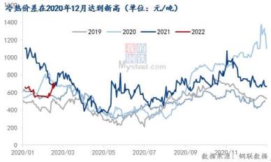 去年同期(2021年2月),由于汽車以及直接出口需求旺盛,冷軋強(qiáng)熱軋弱的局面明顯,冷軋總庫(kù)存累庫(kù)高度同比降幅達(dá)20%,冷熱價(jià)差也拉到新高,月均值達(dá)800元/噸以上。在去年同期冷軋“如火如荼”的行情襯托下,顯得今年的冷軋春天愈發(fā)“寒冷”。