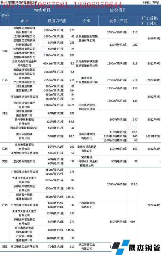據(jù)不完全統(tǒng)計(jì),2022年2月有9家無(wú)縫厚壁鋼管廠家發(fā)布鋼鐵產(chǎn)能置換方案。其中,涉及新建煉鋼產(chǎn)能1328萬(wàn)噸,新建煉鐵產(chǎn)能1320.3萬(wàn)噸;涉及淘汰煉鋼產(chǎn)能超1567.92萬(wàn)噸,淘汰煉鐵產(chǎn)能1395.56萬(wàn)噸。