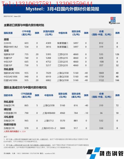 免責聲明:本網站(山東聊城晟杰無縫鋼管廠m.82912.cn)刊載的“2022年03月04日日報:國內外鋼材_無縫鋼管價差匯總(2022.3.4)”等均源于網絡,版權歸原作者所有,且僅代表原作者觀點,本文所載信息僅供參考。轉載僅為學習與交流之目的,如無意中侵犯您的合法權益,請及時聯系刪除。本網站刊登此篇文章并不意味著本站贊同其觀點或證實其內容的真實性,我們不對其科學性、嚴肅性等作任何形式的保證。如果侵犯了您的版權,請盡快聯系我們予以撤銷,謝謝合作!