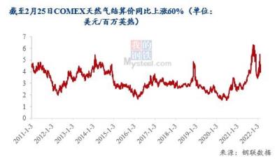 受俄烏沖突影響,截至2月25日,COMEX天然氣結算價4.485美元/百萬英熱,同比上漲60%。整個2月天然氣均價約為4.459,環比上漲12%,同比上漲54%,為2014年后的第二高點。