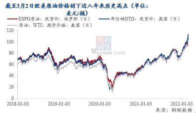 除了天然氣,原油也是俄羅斯主要出口能源類型之一。今年2月,俄羅斯的石油產量同比增長9.3%,達到1105.5萬桶/日。在俄烏沖突之下,原油價格飆升。截至3月2日,美油價格一度沖破了111美元/桶,布油價格一度接近113美元/桶,布油美油的價格都創近8年新高。
