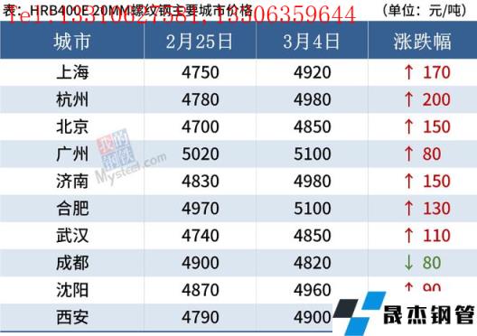 據監測,截至3月4日,全國主要城市20mm三級抗震螺紋鋼均價4946元/噸,周環比上漲77元/噸;8.0mmHPB300高線均價5161元/噸,周環比上漲94元/噸。