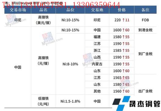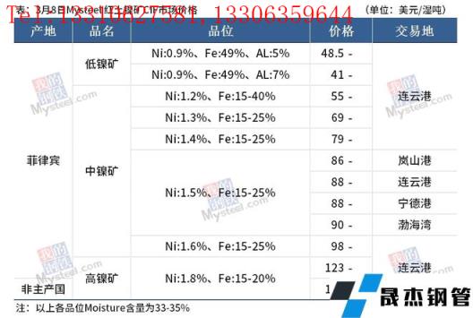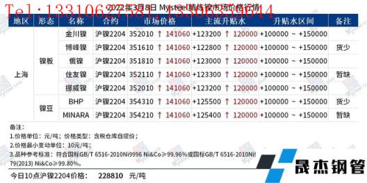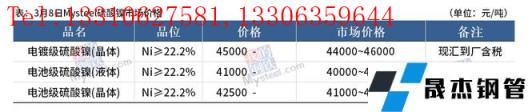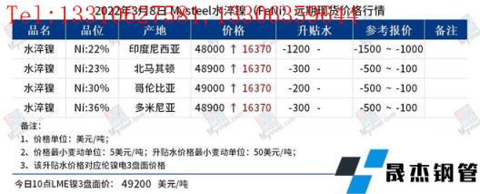 免責聲明:本網(wǎng)站(山東聊城晟杰無縫鋼管廠m.82912.cn)刊載的“鎳產(chǎn)業(yè)鏈價格(2022.3.8)”等均源于網(wǎng)絡(luò),版權(quán)歸原作者所有,且僅代表原作者觀點,本文所載信息僅供參考。轉(zhuǎn)載僅為學習與交流之目的,如無意中侵犯您的合法權(quán)益,請及時聯(lián)系刪除。本網(wǎng)站刊登此篇文章并不意味著本站贊同其觀點或證實其內(nèi)容的真實性,我們不對其科學性、嚴肅性等作任何形式的保證。如果侵犯了您的版權(quán),請盡快聯(lián)系我們予以撤銷,謝謝合作!