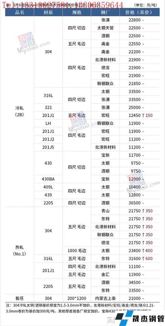3月8日無錫市場300系價格偏強運行,日內(nèi)民營冷熱軋價格漲幅1550-1600元/噸,截至下午四點,民營304冷軋主流價格至21900-22000元/噸毛基,民營熱軋資源五尺毛邊主流價格至21650-21950元/噸;200系價格偏強運行,日內(nèi)冷熱軋有400元/噸左右的上漲,截至下午四點,無錫市場201J2/J5四尺冷軋價格主流成交在11200-11300元/噸毛基,五尺熱軋主流成交在11900-12000元/噸;400系價格穩(wěn)中偏強運行,目前太鋼、酒鋼430冷軋切邊主流價格9750-9900元/噸。