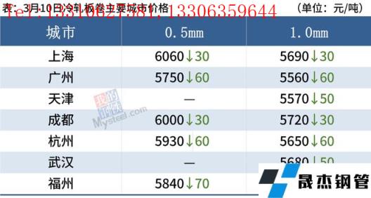 冷軋板卷:3月10日,全國24個主要城市1.0mm冷卷均價5677元/噸,較上個交易日下跌31元/噸。隨著期貨盤面連續(xù)下跌,價格也隨之下調(diào),市場交投氛圍明顯冷清,今日整體成交一般。心態(tài)方面,部分庫存較大的貿(mào)易商還是以出貨降庫為主,心態(tài)較為謹慎。庫存方面,據(jù)不完全統(tǒng)計,現(xiàn)冷軋無縫厚壁鋼管廠家?guī)齑?4.57萬噸,周環(huán)比減少2.23萬噸,社會庫存143.40萬噸,周環(huán)比增加0.97萬噸,周消費量80.22萬噸,環(huán)比減少2.64萬噸。綜合來看,故預計11日國內(nèi)冷軋板卷價格或?qū)⑵踹\行。
