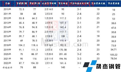 對比歷史數據來看,近10年來春節后廣州建筑厚壁無縫鋼管庫存峰值均出現第3-5周,累庫周期約24天左右;近5年來節后庫存累庫量明顯上升,節后峰值水平均超過150萬噸以上,而2017年之前節后庫存峰值均在140萬噸以內。近年來,隨著經濟發展以及供應擴張,春節前市場主動性冬儲積極性增加,整體的庫存量出現明顯上升; 雖然2022年節前價格偏高,但節前現貨價格上漲,帶動市場不少商家主動性囤貨、備貨,節前庫存總量并未出現明顯累庫現象。節后開市,在疫情等因素影響下,累庫速度遠低于去年,今年庫存呈現的特點是,累庫速度快,累庫量大,周期短等特點。同時再加上今年節后不少短流程企業并未完全恢復生產,自然資源供應量有所減量,節后累庫低于往年,且今年峰值出現在3月第1周,第二周迎來庫存拐點。