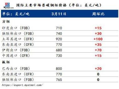在獨聯體鋼坯供應中斷之后,土耳其方坯價格不斷上漲,本周價格繼續上漲。目前土耳其方坯國內價格約為920-950美元/噸FOB,較上周大幅上漲約100美元/噸。據了解,土耳其方坯價格由于廢鋼等成本上升而上漲,市場需求也支撐價格上漲。自沖突發生以來,土耳其方坯價格上漲約200美元/噸,主要買家來自歐洲,埃及,非洲。其中,埃及市場緊缺方坯,采購價格高達830美元/噸CFR,但由于目前土耳其出口價格上漲,加之受信用證限制,成交較為困難。