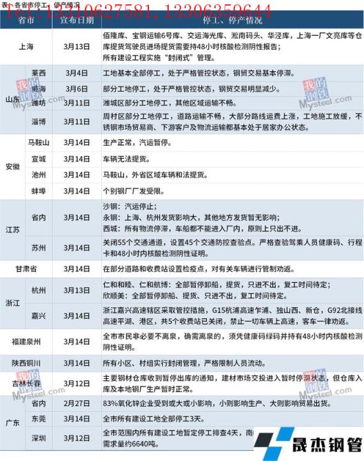 近期,全國疫情呈現(xiàn)局部高度聚集和多點散發(fā)態(tài)勢,對國內大宗商品市場的供應端、需求端、物流及倉儲等方面都有不同程度的影響。據(jù)統(tǒng)計,截至3月15日,全國多個省市發(fā)布停工停產情況。其中受疫情影響最大的吉林省于3月12日宣布,長春市主要厚壁無縫鋼管倉庫暫停出庫,當?shù)亟ú氖袌鼋煌哆M入暫時停滯狀態(tài),倉庫入庫及本地無縫厚壁鋼管廠家生產暫時正常。深圳市于3月12日宣布,全市范圍內所有建設工地暫定停工排查4天,南山及福田區(qū)域厚壁無縫鋼管市場預計共影響需求量約6640噸。與此同時,全國其他地區(qū)鋼貿交易也受到影響,部分工地開始停工,物流運輸暫停服務。具體情況如下: