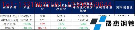 依據(jù)統(tǒng)計局發(fā)布數(shù)據(jù),2022年1-2月累計粗鋼產(chǎn)量同比降幅約10%左右,絕對量達到1.6億噸,去年同期約為1.8億噸;受今年國外形勢變化,鋼坯預(yù)估凈進口同比增幅達到86%,厚壁無縫鋼管折算粗鋼凈出口降幅達到22%,因此測算粗鋼表觀消費量達到1.55億噸,同比降幅約8.6%;另外考慮到庫存變化因素,將其折算至粗鋼,測算粗鋼實際消費量達到1.44億噸,同比降幅約5%,需求降幅表現(xiàn)明顯好于市場預(yù)期。