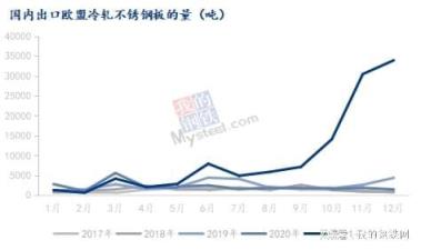 從中國海關數據顯示,2021年12月,中國大陸出口歐盟的不銹鋼冷軋量約至3.4萬噸,創近年來新高。2019年年均量約2502噸,2020年約2203噸,2021年約9623噸。