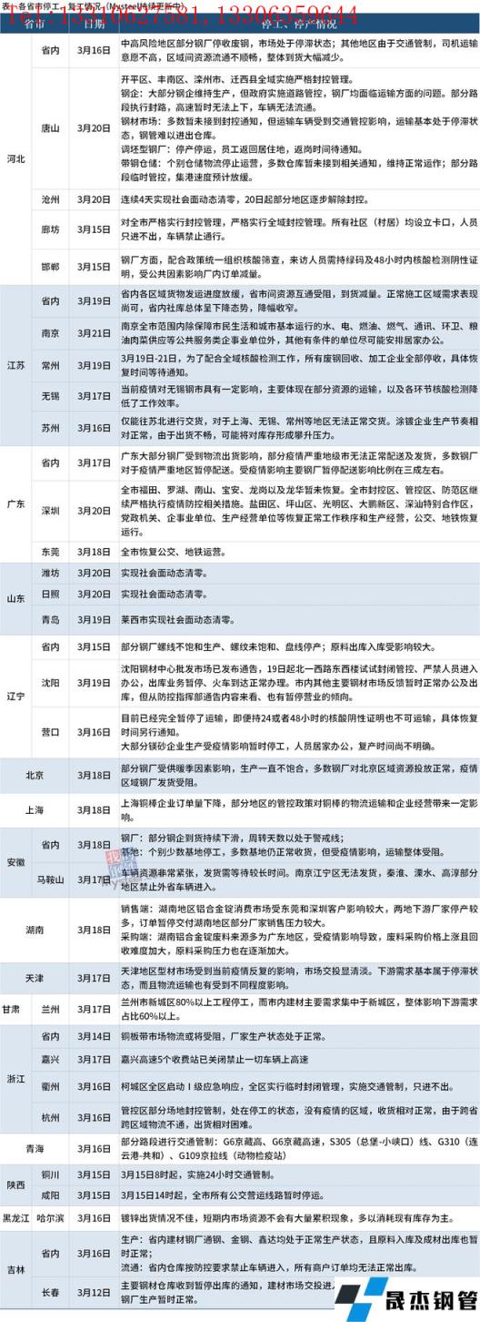 截至3月21日,匯總了16個省份停工停產最新信息。其中,3月21日,南京全市范圍內除保障市民生活和城市基本運行的水、電、燃油、燃氣、通訊、環衛、糧油肉菜供應等公共服務類企事業單位外,其他有條件的單位盡可能安排居家辦公。3 月20日,唐山開平區、豐南區、灤州市、遷西縣全域實施嚴格封控管理;大部分鋼企維持生產,但政府實施道路管控,無縫厚壁鋼管廠家均面臨運輸方面的問題。深圳全市福田、羅湖、南山、寶安、龍崗以及龍華暫未恢復,全市封控區、管控區、防范區繼續嚴格執行疫情防控相關措施。山東濰坊日照、青島萊西市實現社會面動態清零。河北滄州連續4天實現社會面動態清零,3月20日起部分地區逐步解除封控。具體情況如下:
