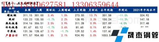 供應方面,本周五大厚壁無縫鋼管品種供應增至971.57萬噸,增量16.77萬噸,增幅1.8%,其中建材環比增量7.9萬噸,增幅1.8%,板材環比增量8.89萬噸,增幅1.7%。