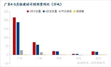 2、5月廣東地區(qū)建筑材區(qū)內(nèi)(廣東和廣西)計劃供應量共計290萬噸,環(huán)比增加7.9萬噸,增幅2.8%;區(qū)外計劃供應量為49.1萬噸,環(huán)比增加0.2萬噸,增幅0.4%;
