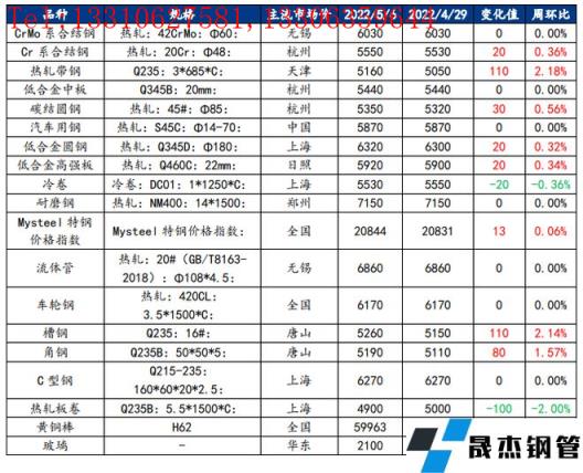核心觀點:上周厚壁無縫鋼管市場整體小幅上漲,五一假期前后,市場存在小幅度的需求放量,疊加節前現貨成本普遍偏高,因此現貨價格多數在節后小幅上漲;另一方面,市場對于疫情緩解后的需求釋放情況保持樂觀,因此從預期方面而言也多以看漲較多;在有色方面,整體下游行業消費不及預期,銅、鋁上周價格有所下滑,市場整體呈現較為弱勢。
