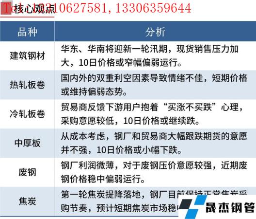焦炭:5月9日,焦炭市場偏弱運行,焦炭市場全面落實第一輪降價,降幅為200元/噸。原料方面,短期內煤價有下跌預期,焦企多以按需采購和消化庫存為主,煤炭需求階段性走弱,焦企開工繼續上升,場內基本零庫存運行,即產即銷,多以積極出貨為主。無縫厚壁鋼管廠家方面,第一輪焦炭提降落地,無縫厚壁鋼管廠家目前保持正常焦炭采購節奏,考慮到鐵水高產,目前看焦炭回落空間有限,預計短期內焦炭市場穩中偏弱運行。